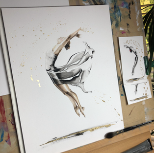 Once I’m back at my easel I'm doodling, conjuring up the dance studio mood, creating black and white quick sketches to get familiar with the pose and the composition. Colour comes next. For these images I had some brightly coloured rose petals to kick start my creativity but in the end I landed on a gold and black theme.